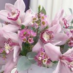 Нежная композиция из розовых орхидей и эвкалипта