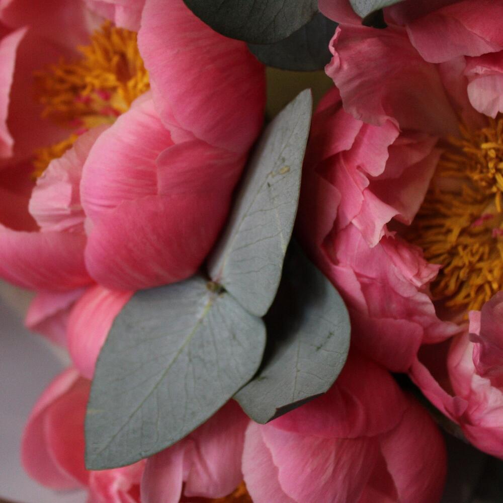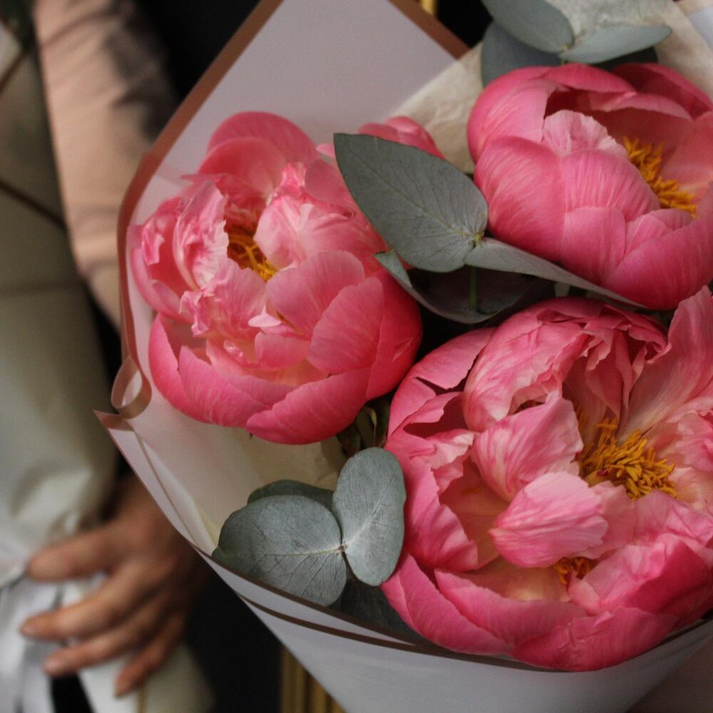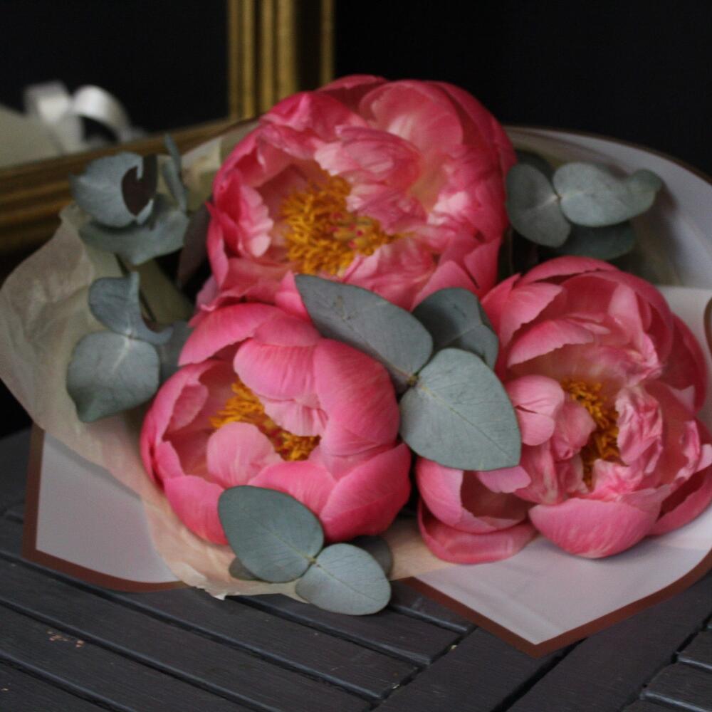 3 коралловых пиона с эвкалиптом