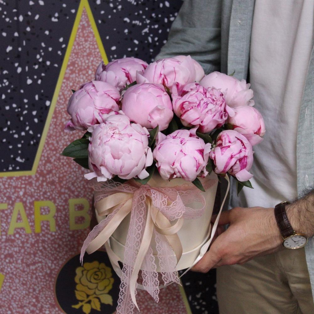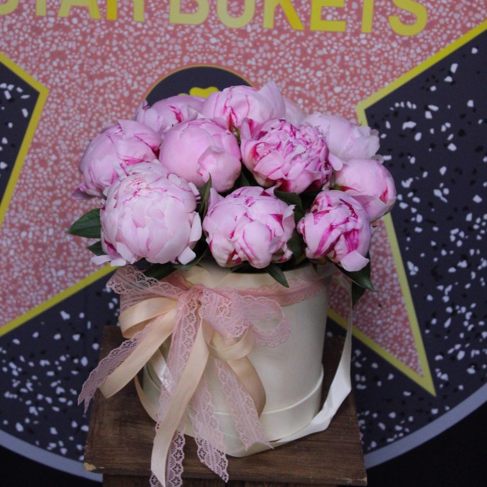 Лента атласная – 4 шт.Шляпная коробка – 1 шт.Пион Сара Бернар – 11 шт.Оазис флористический – 1 шт.