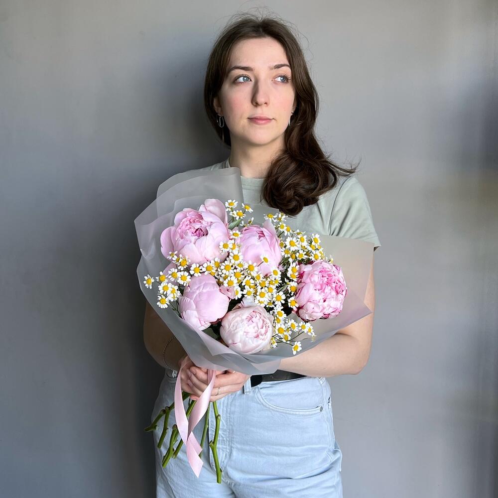 Лента – 1 шт.Матрикария – 4 шт.Пион нежно розовый – 5 шт.Дизайнерская упаковка – 1 шт.