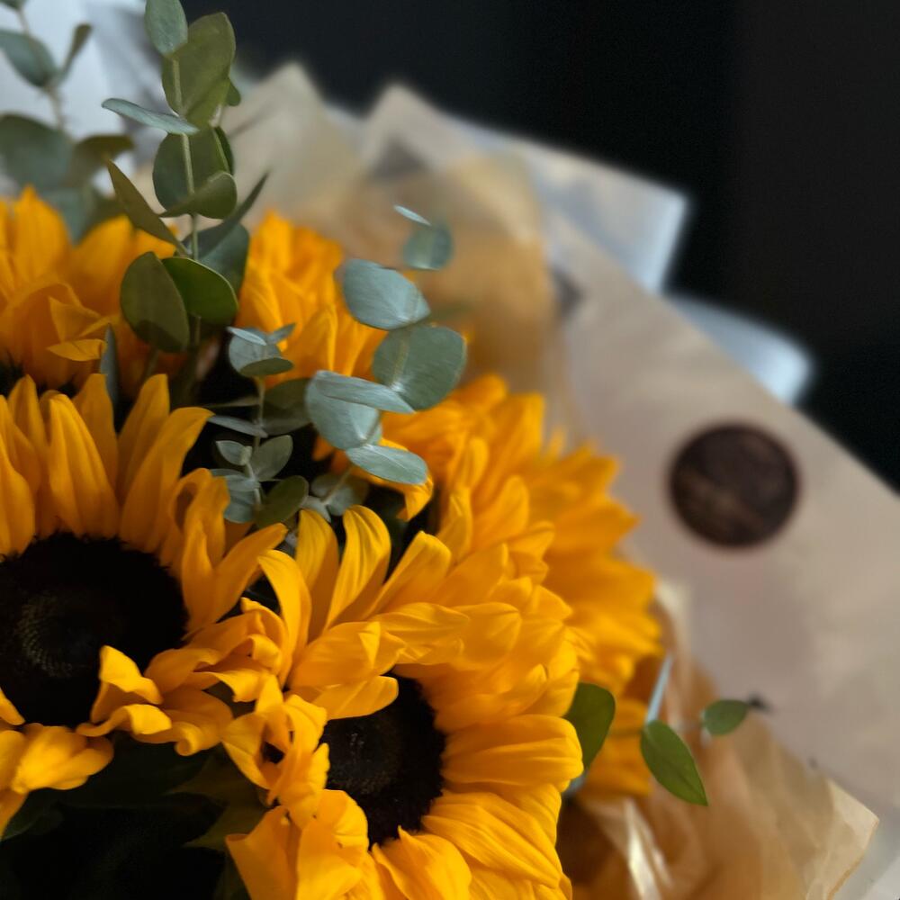 Подсолнух – 11 шт.Эвкалипт – 5 шт.декоративная упаковка – 1 шт.Атласная лента – 1 шт.