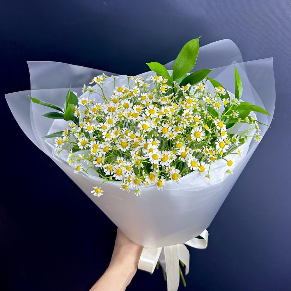 Рускус – 3 шт.Упаковка дизайнерская – 1 шт.Матрикария (ромашка) – 9 шт.