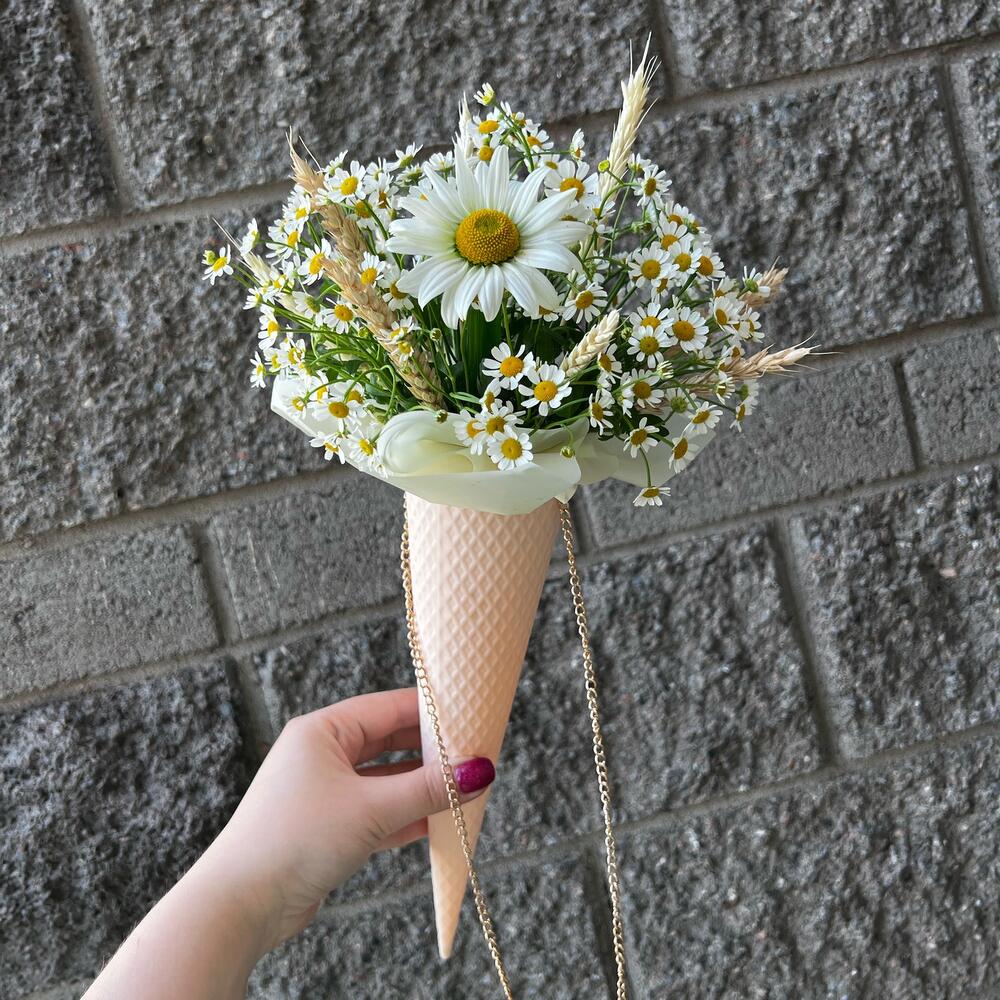 Цветы в рожке на цепочке с ромашками и колосьями пшеницы