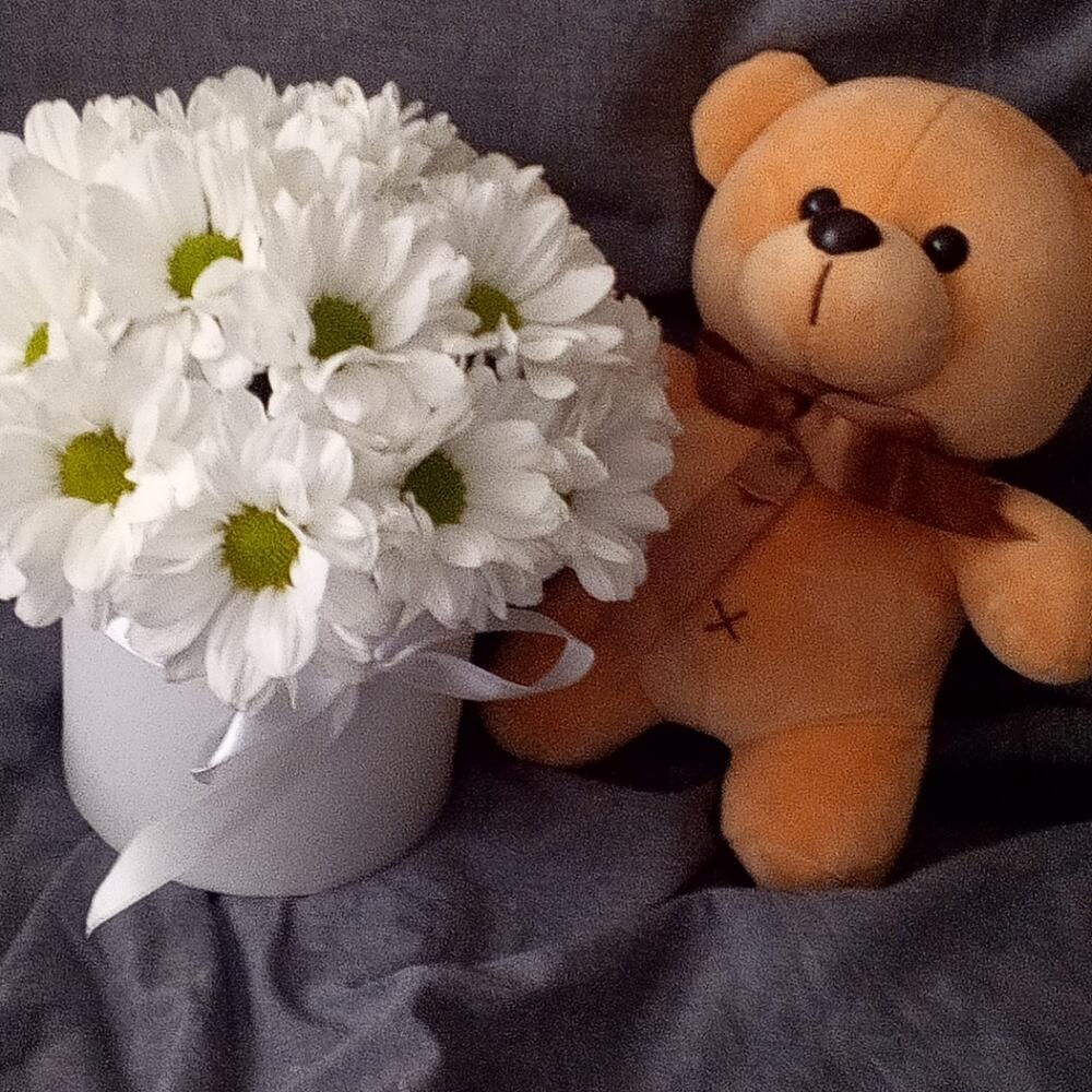 Ромашка – 17 шт.Шляпная коробка с лентами – 1 шт.Мишка плюшевый – 1 шт.Флористическая губка – 1 шт.