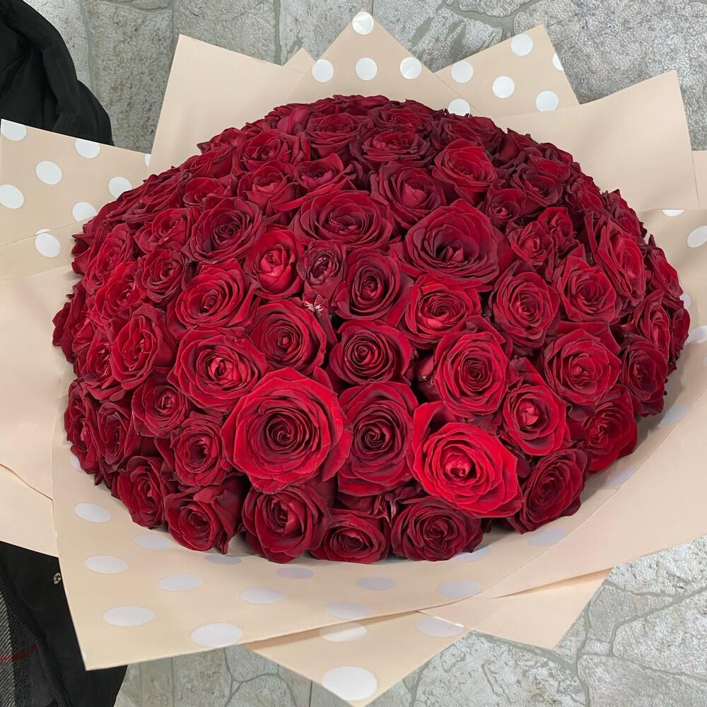 Роза – 101 шт.Упаковка – 5 шт.Атласная лента – 1 шт.