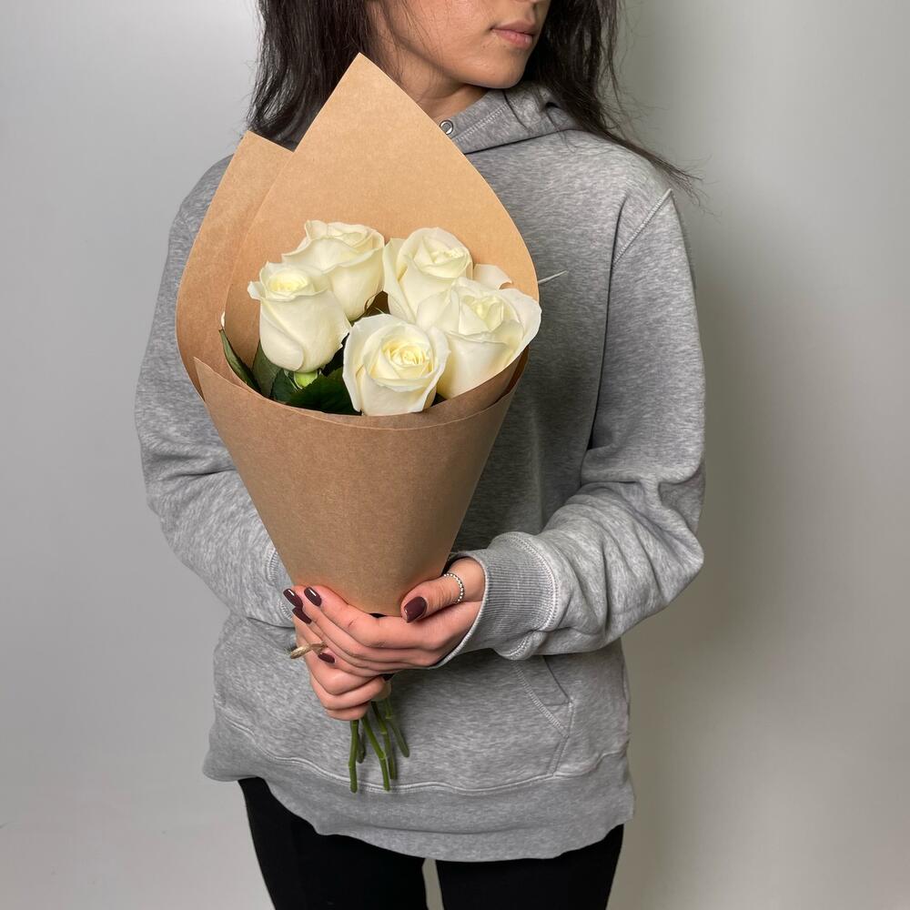 5 белых роз в крафте
