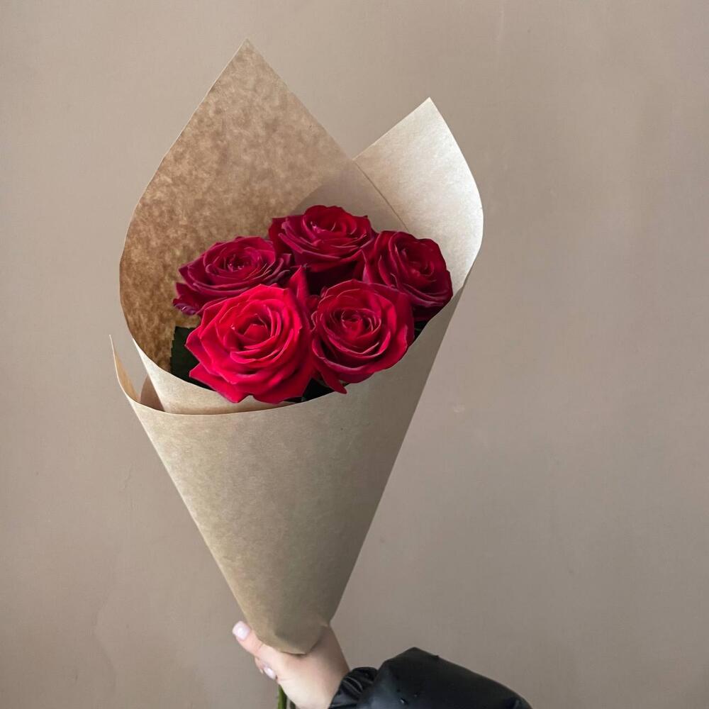 Роза красная россия – 5 шт.Крафт дизайнерский – 1 шт.