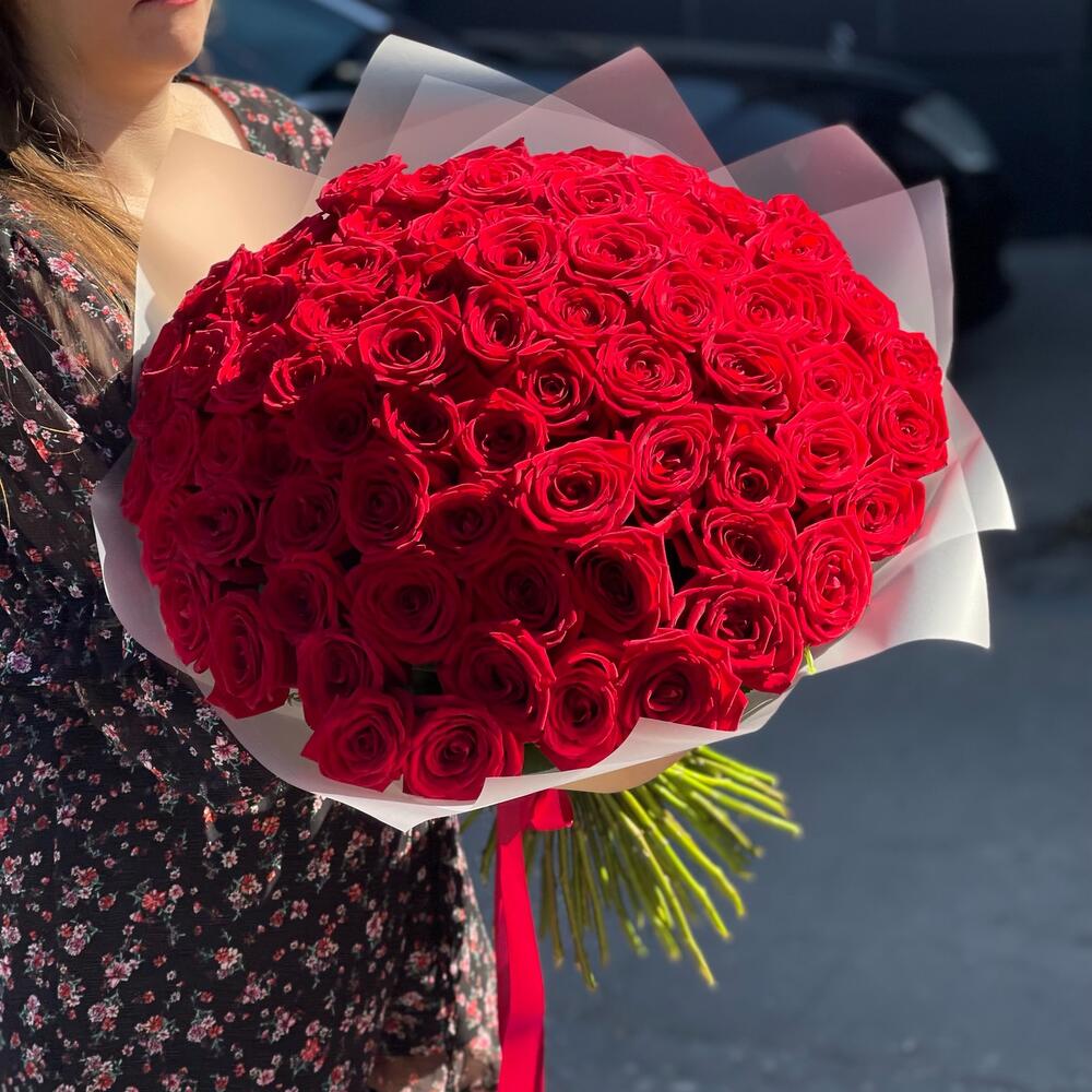 Роза красная 60 см – 75 шт.Упаковка дизайнерская – 4 шт.Открыточка с вашими пожеланиями – 1 шт.подкормка для срезанных цветов – 1 шт.