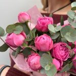 Эвкалипт – 1 шт.Тишью – 1 шт.Роза кустовая пионовидная – 3 шт.Оазис флористический – 1 шт.коробка шляпная 12х15 – 1 шт.