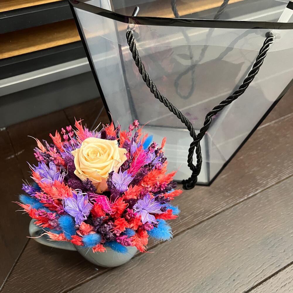Роза стабилизированная – 1 шт.Пшеница (сухоцвет) – 30 гр.Лагурус (сухоцвет) – 30 гр.Лаванда (сухоцвет) – 20 гр.