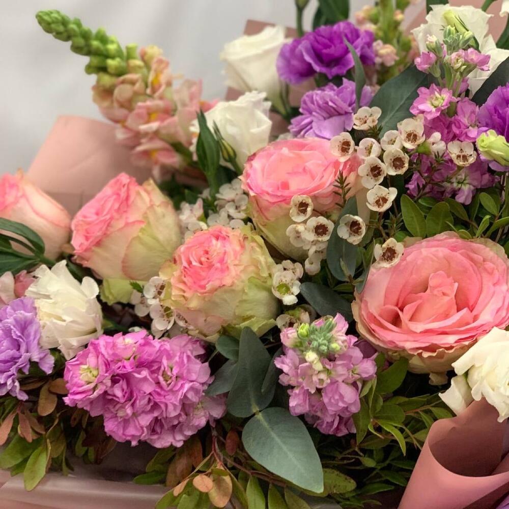 Роза Эквадор – 5 шт.антиринум – 3 шт.Маттиола – 3 шт.Лизиантус – 3 шт.Диантус – 4 шт.Ваксфлауэр – 2 шт.Эвкалипт – 6 шт.Фисташка – 6 шт.