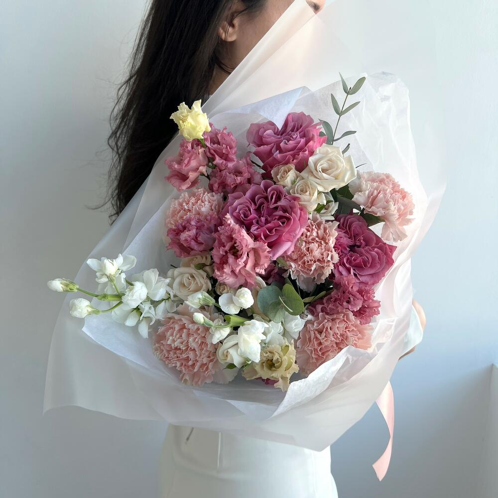 Маттиола – 2 шт.Эвкалипт – 1 шт.Кустовая роза – 3 шт.Гвоздика – 5 шт.Эустома – 1 шт.Пионовидная роза – 3 шт.