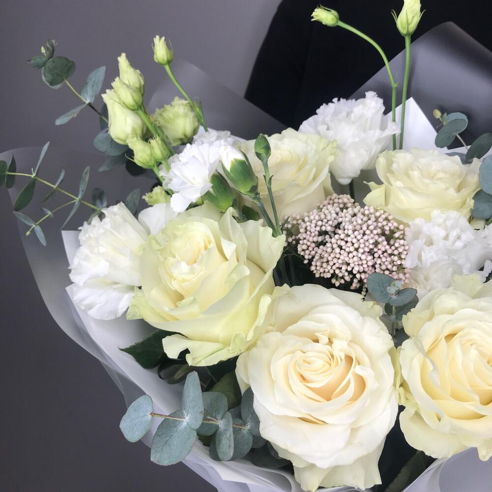Лизиантус – 2 шт.Озотамнус – 1 шт.Эвкалипт – 2 шт.Гвоздика кустовая – 3 шт.Роза белая – 5 шт.Упаковка дизайнерская – 1 шт.комплимент от polyanka – 1 шт.