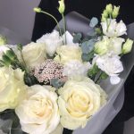 Бело-зелёный букет с розой мондиаль, эвкалиптом и лизиантусом