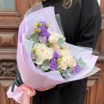 Эвкалипт – 3 шт.Лента атласная – 2 шт.Тишью – 2 шт.Пленка матовая – 3 шт.роза пионовидная вайт o’hara – 3 шт.роза мэнсфилд парк – 1 шт.эустома лавандовая махровая – 2 шт.