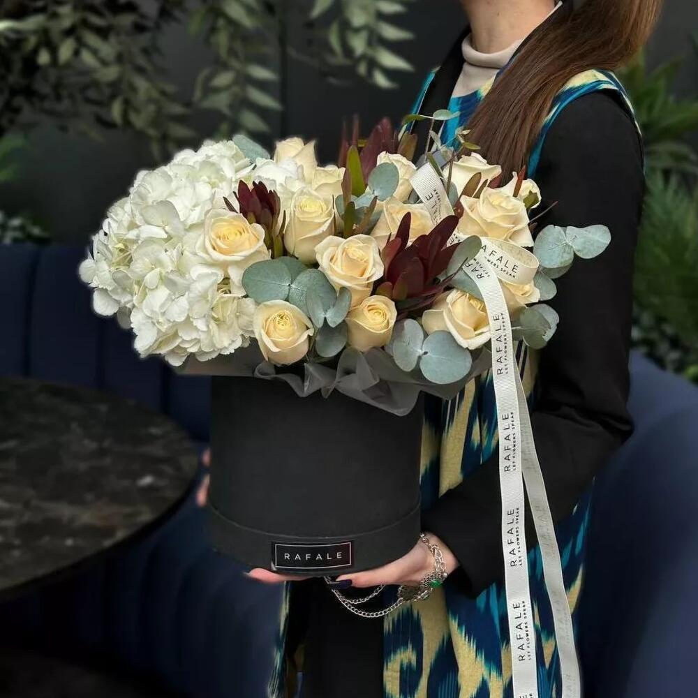 Роза Голландская – 15 шт. Гортензия – 1 шт. Сафари – 2 шт. Эвкалипт – 3 шт. Коробка шляпная – 1 шт.