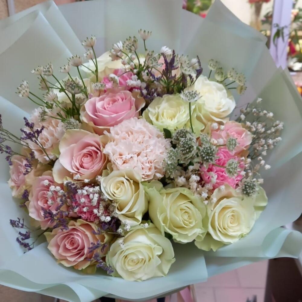 Букет 19 роз и гвоздик “Зефир ” из роз и гвоздик