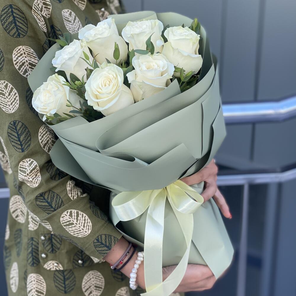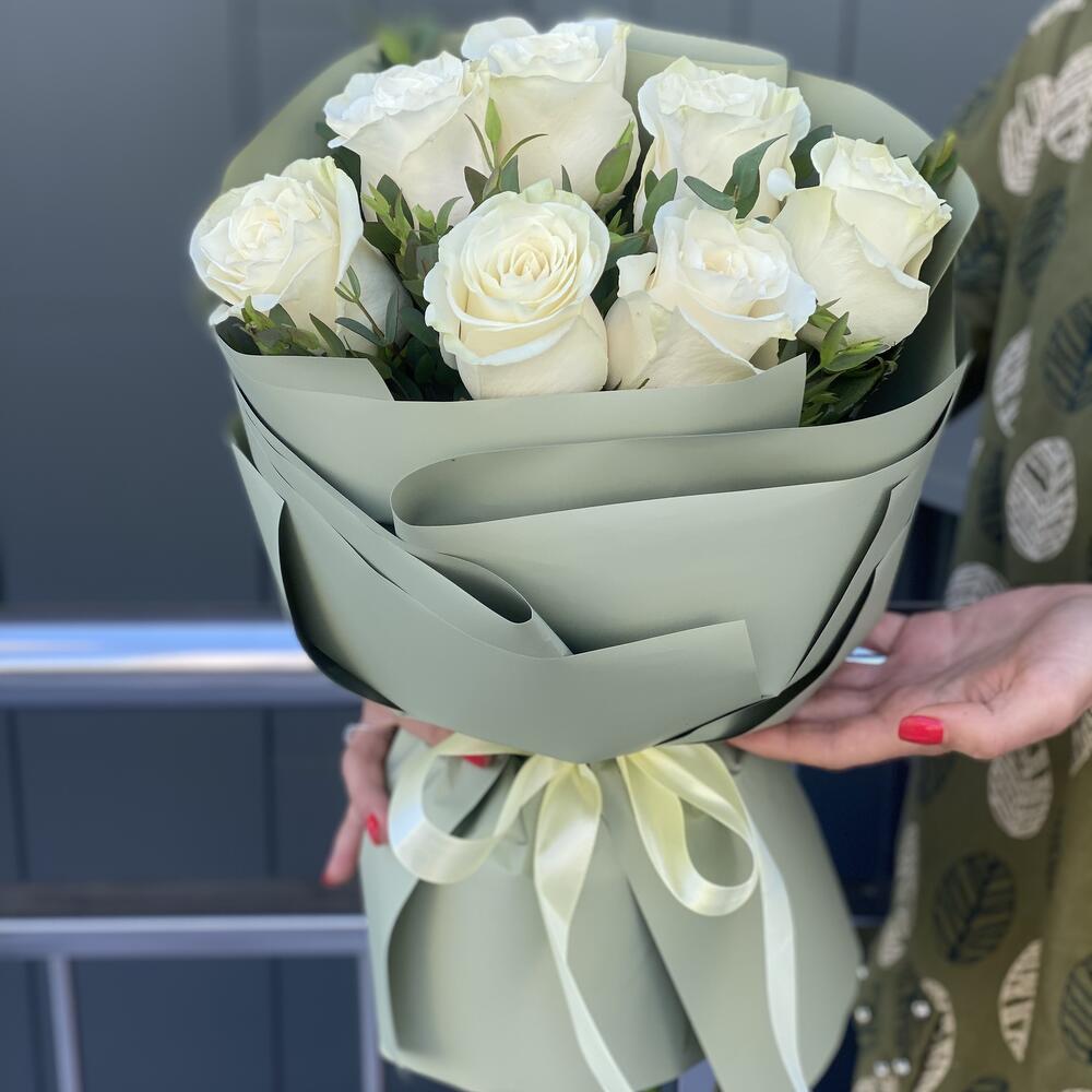Эвкалипт – 2 шт. Роза белая – 7 шт. Оформление – 1 шт.