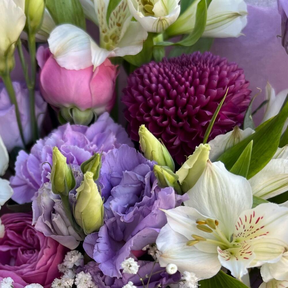 Альстромерия – 2 шт.Гипсофила – 1 шт.Фрезия – 1 шт.Лента атласная – 1 шт.Диантус – 2 шт.Роза кустовая пионовидная – 2 шт.Упаковка дизайнерская – 3 шт.подкормка для срезанных цветов – 1 шт.памятка по уходу – 1 шт.хризантема густав – 1 шт.