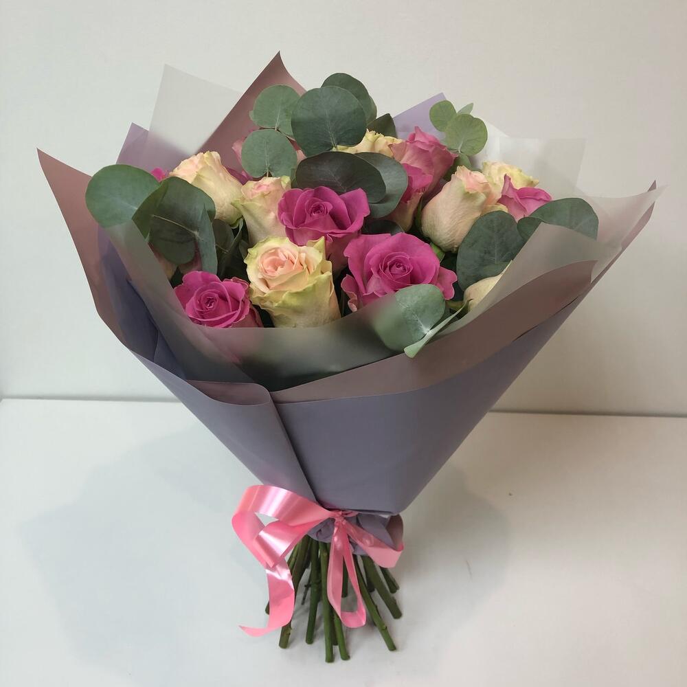 Роза – 19 шт.Эвкалипт – 3 шт.Пленка матовая – 1 шт.