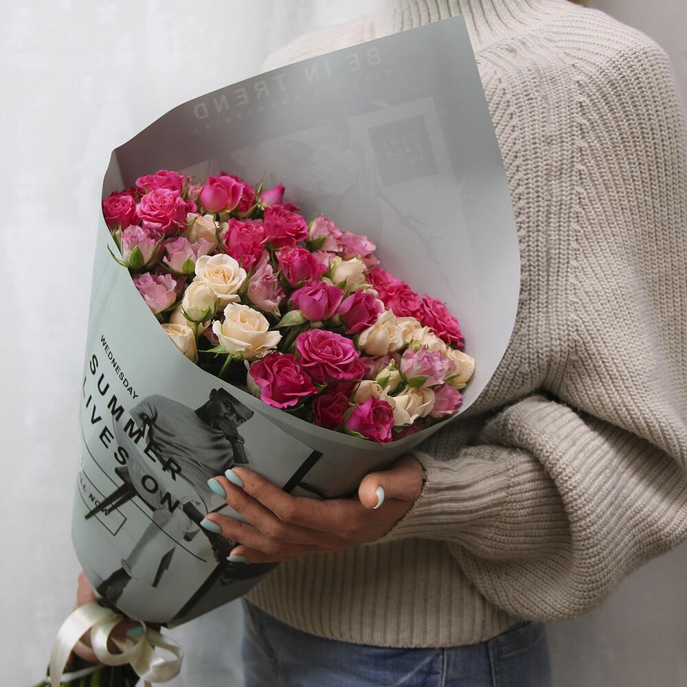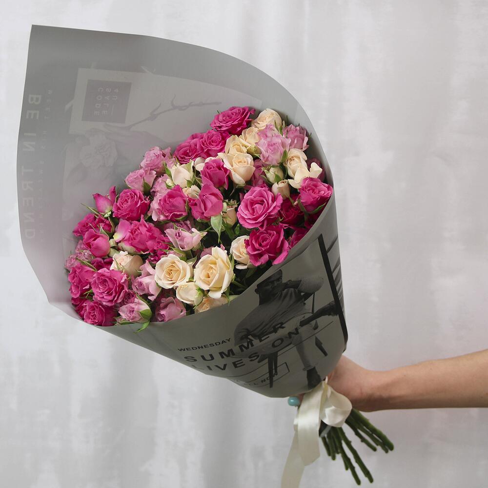 кустовая роза 60-70 см – 15 шт.Пленка – 1 шт.Лента – 1 шт.