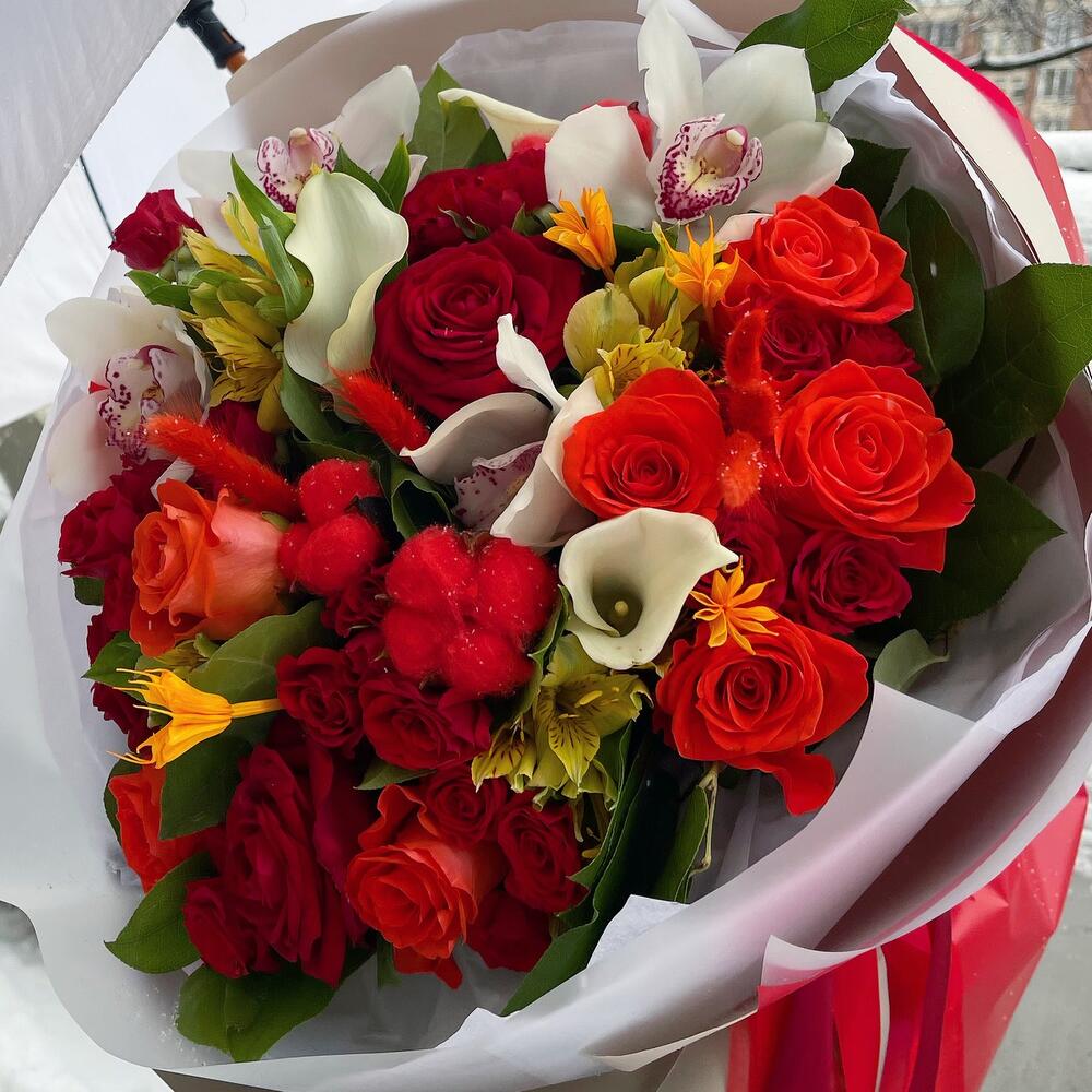 Роза Россия – 12 шт.Кустовая роза красная – 9 шт.орхидея белая цимбидиум – 4 шт.Калла белая – 3 шт.Альстромерия – 6 шт.Хлопок натуральный – 3 шт.Салал пучок – 1 шт.Тишью белое – 6 шт.Пленка матовая – 8 шт.