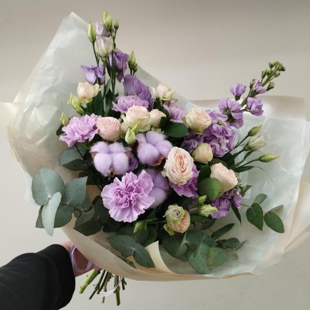 Роза кустовая – 2 шт.Хлопок – 3 шт.Диантус – 5 шт.Лизиантус – 1 шт.Маттиола – 2 шт.Эвкалипт – 1 шт.