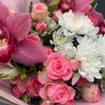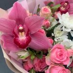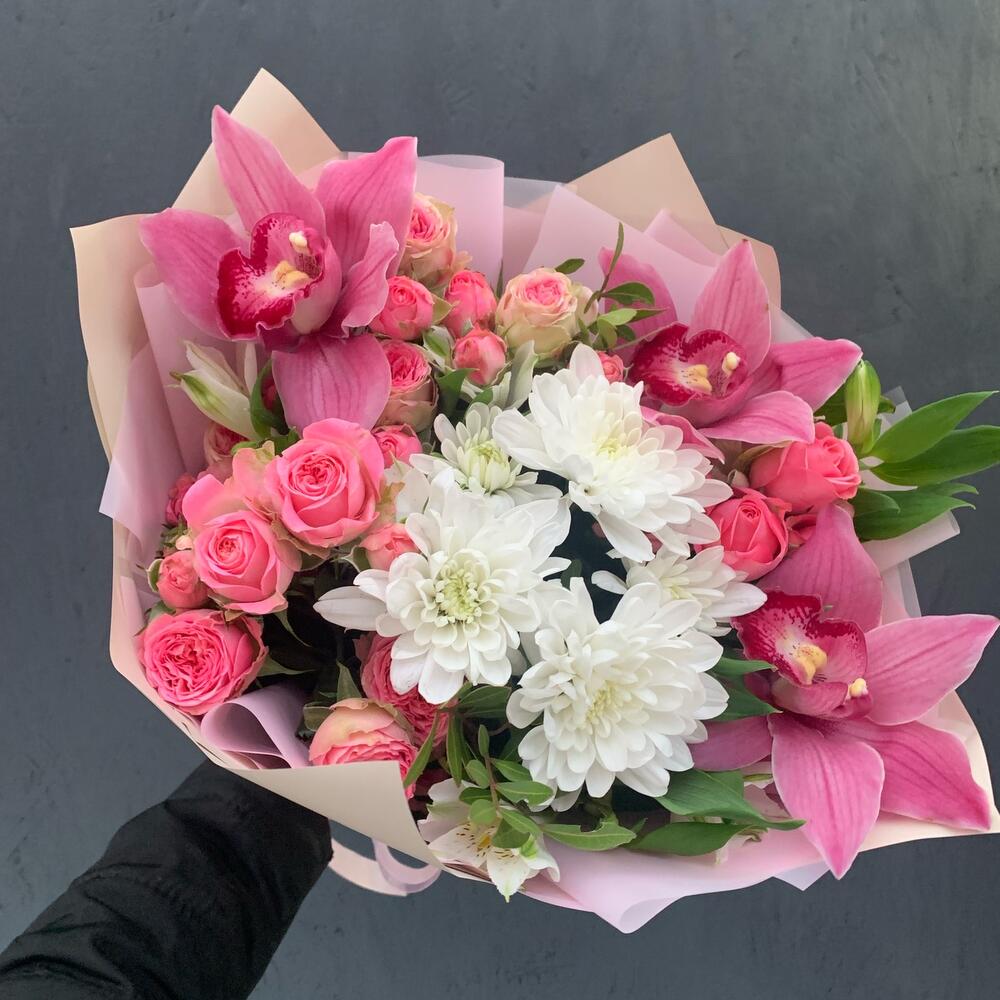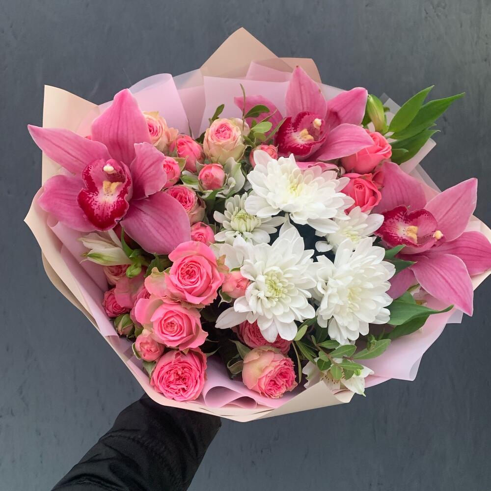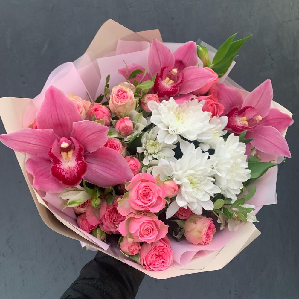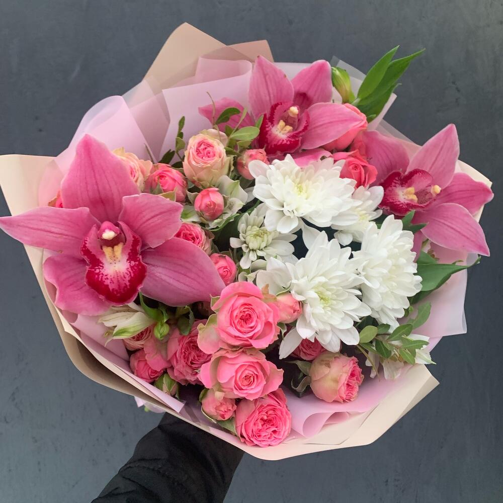 Букет из кустовой хризантемы, орхидей и кустовых роз «Каролина»