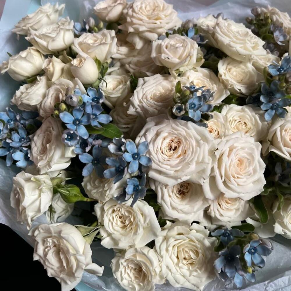 Кустовая роза – 13 шт.Оксипеталум – 14 шт.декоративная упаковка – 1 шт.Атласная лента – 1 шт.