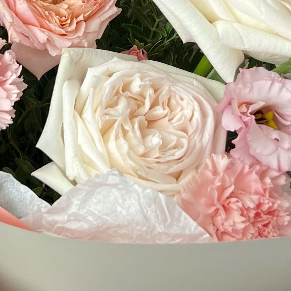 Эустома – 1 шт.Диантус – 2 шт.Фисташка – 3 шт.Пионовидная кустовая роза julliet – 1 шт.Дизайнерская упаковка – 3 шт.пионовидная роза white o’hara – 3 шт.