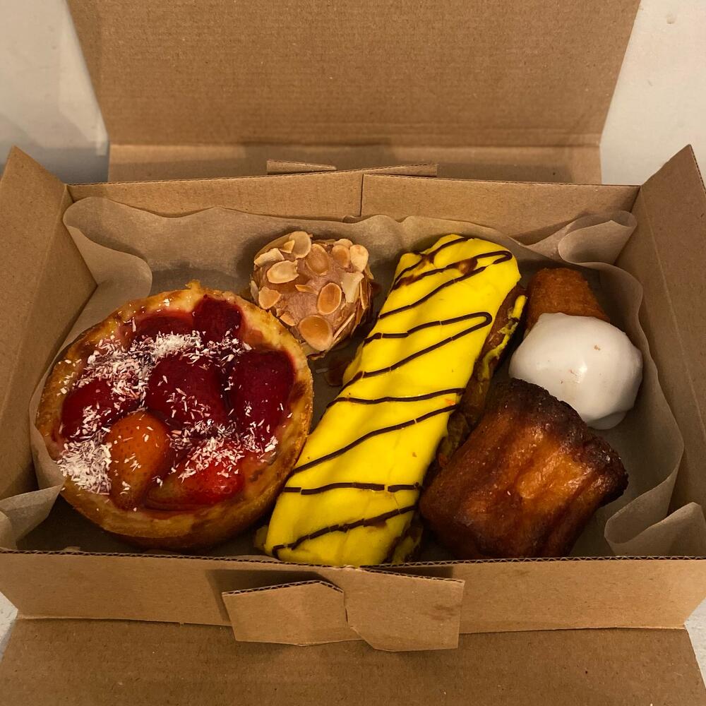 Роза садовая – 1 шт.Лизиантус – 2 шт.Хризантема кустовая – 3 шт.Краспедия – 2 шт.зелень декоративная – 1 шт.Упаковка дизайнерская – 1 шт.Лента атласная – 1 шт.Открытка – 1 шт.крафтовая коробочка – 1 шт.Эклер – 1 шт.канеле – 1 шт.ром баба – 1 шт.миндальная конфета – 1 шт.Фруктовая корзина – 1 шт.