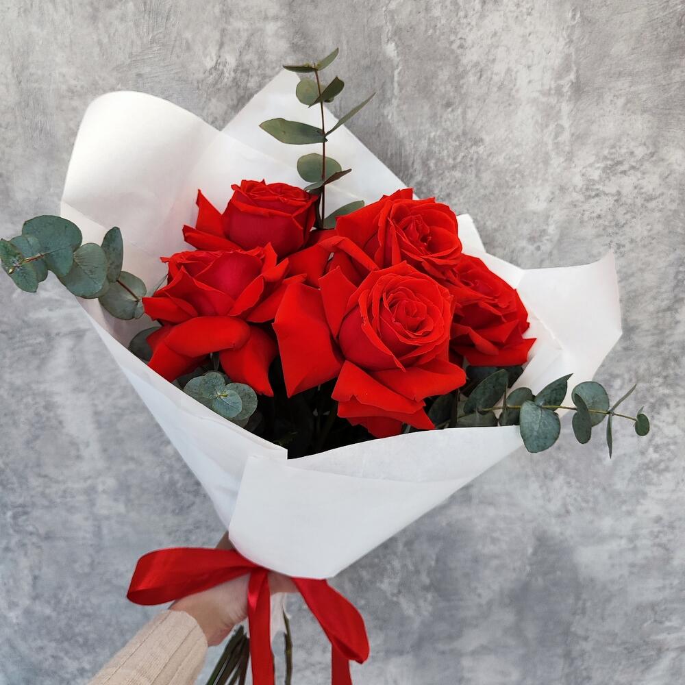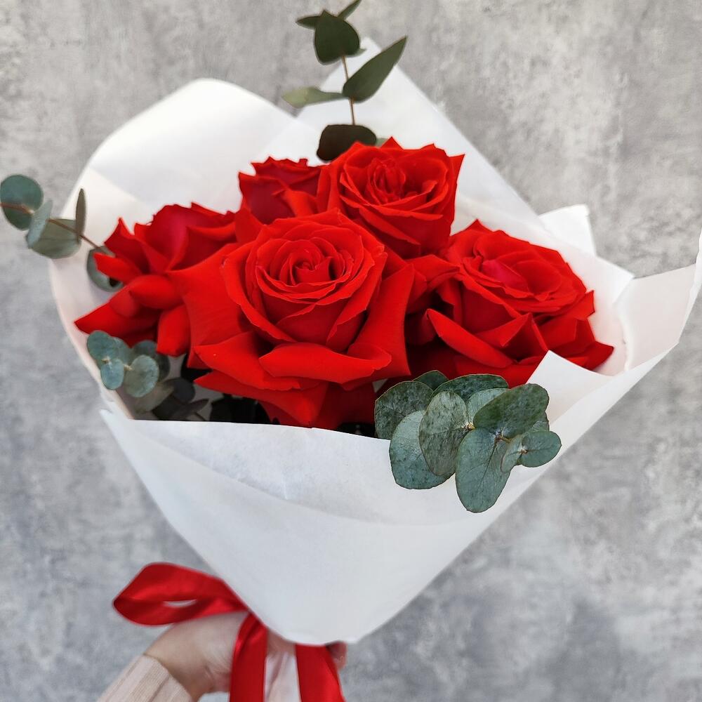 Эвкалипт – 3 шт.Атласная лента – 1 шт.Авторская упаковка – 1 шт.роза красная нина – 5 шт.