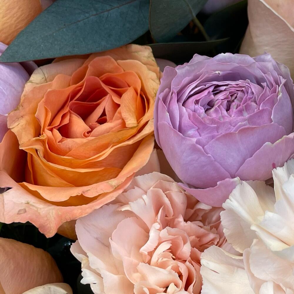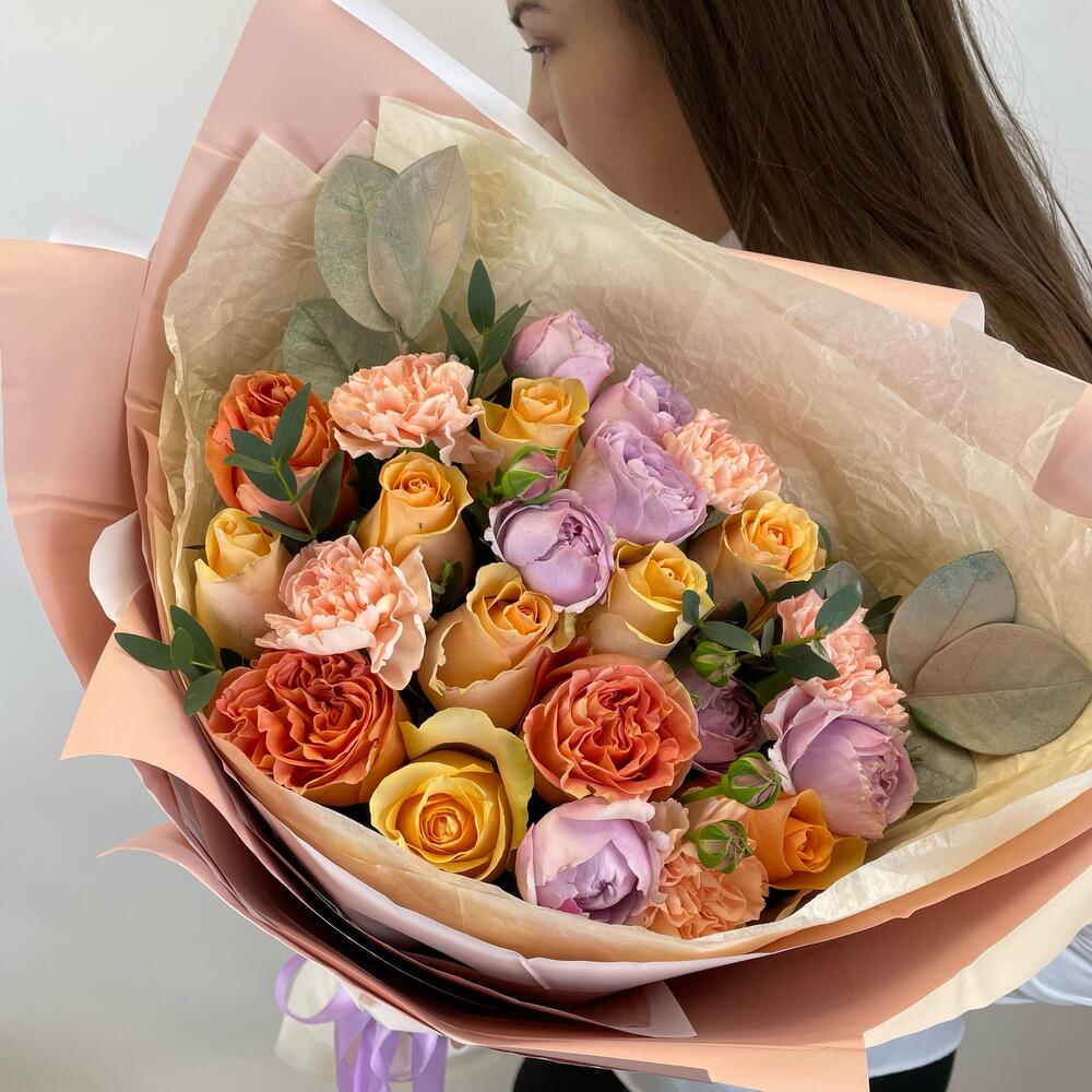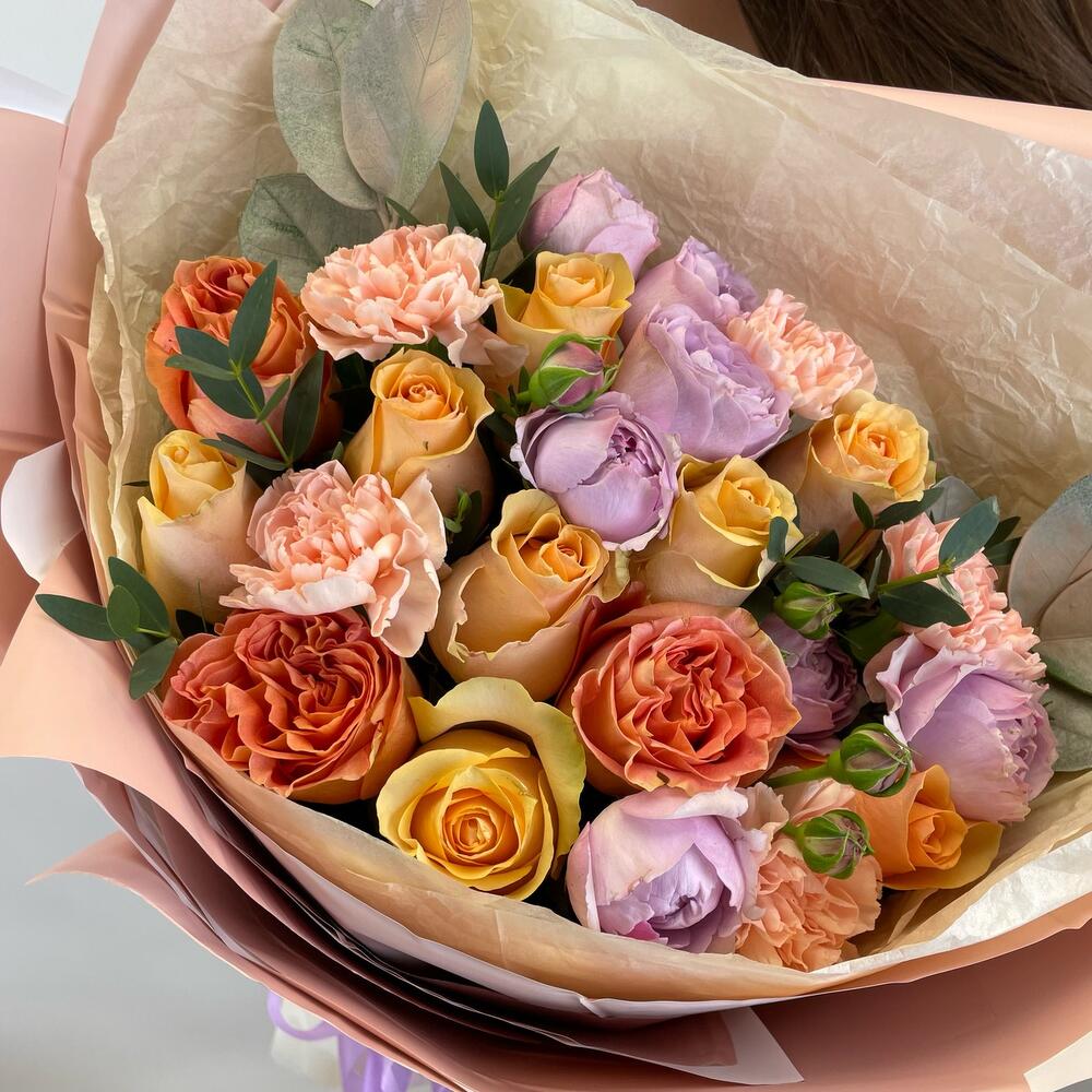 Папоротник – 3 шт.Эвкалипт – 2 шт.Роза – 8 шт.Кустовая роза – 2 шт.Диантус – 5 шт.Оформление – 2 шт.