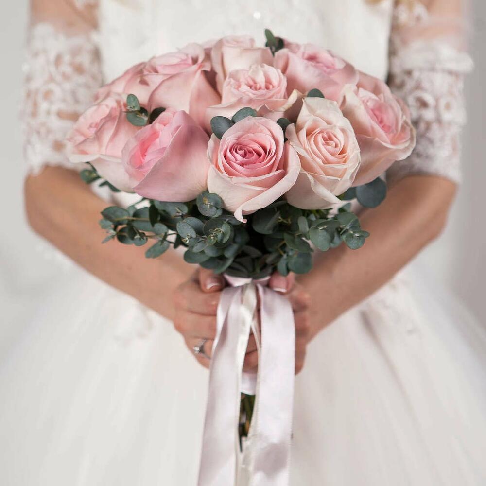 Лента – 2 шт.Эвкалипт – 1 шт.Роза – 15 шт.