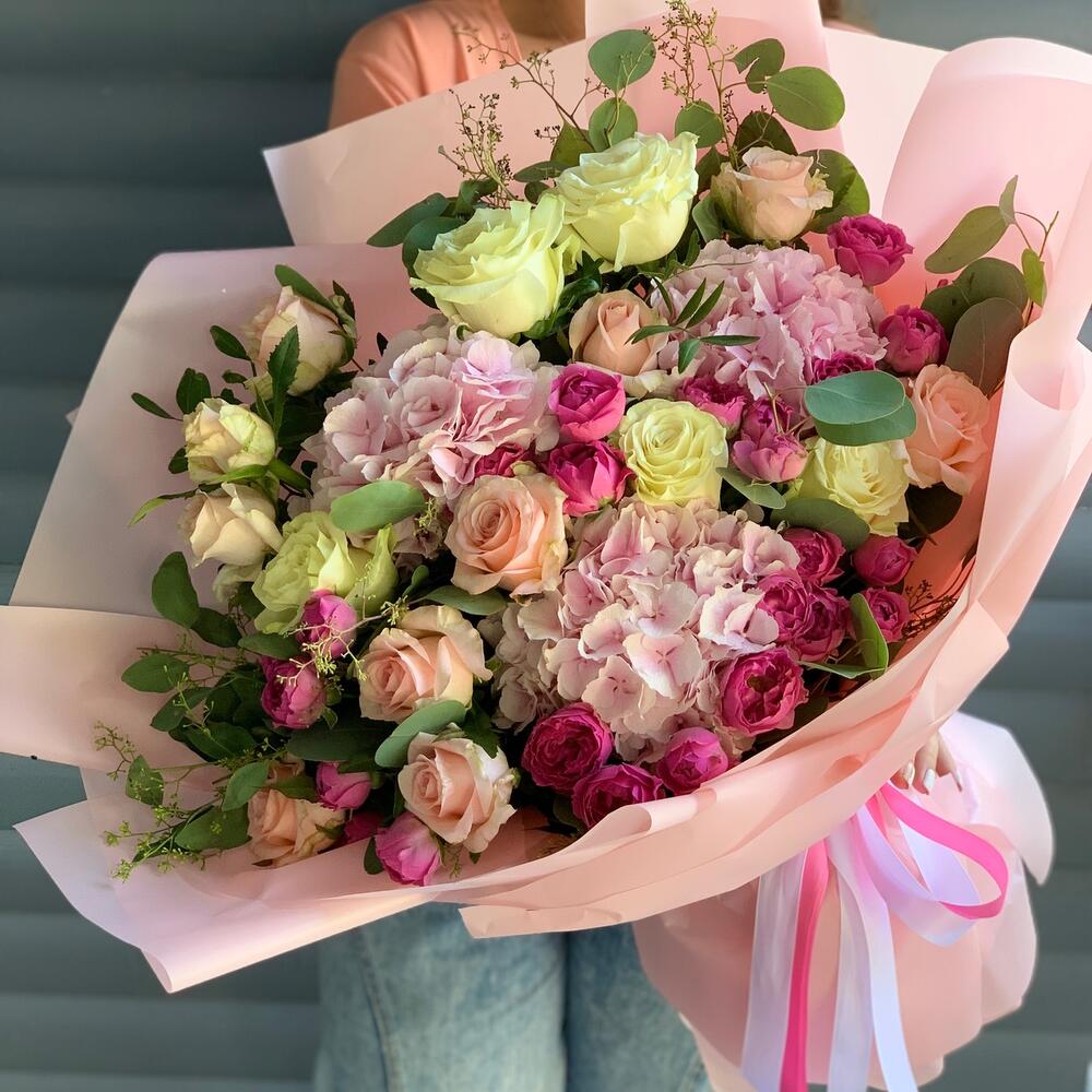 Гвоздики, Кустовые розы, Лизиантусы, Пионовидные розы, Розы