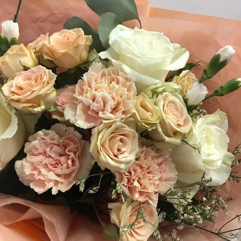 Роза – 3 шт.Роза кустовая – 2 шт.Гвоздика кустовая – 2 шт.Лимониум – 1 шт.Эвкалипт – 1 шт.Гвоздика – 3 шт.Упаковка дизайнерская – 1 шт.Открыточка с вашими пожеланиями – 1 шт.