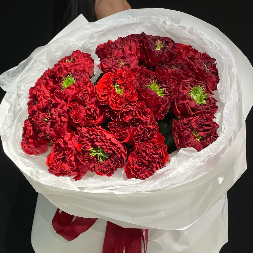 Букет из пионовидных роз – это прекрасная композиция из роз, которые имеют форму и текстуру, напоминающую пионы. Эти розы обладают большими, пышными цветками с множеством лепестков, создавая эффект роскоши и изысканности. Они могут быть разных оттенков, от нежных пастельных до ярких и насыщенных цветов. Букет из пионовидных роз выглядит очень элегантно и романтично, идеально подходит для особых случаев и подарков.