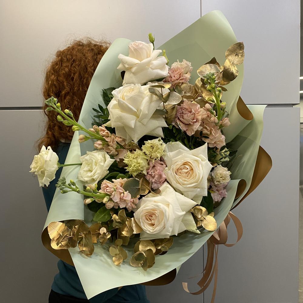роза о’хара – 5 шт.Маттиола – 3 шт.Эвкалипт – 1 шт.Гвоздика – 3 шт.Лизиантус – 2 шт.