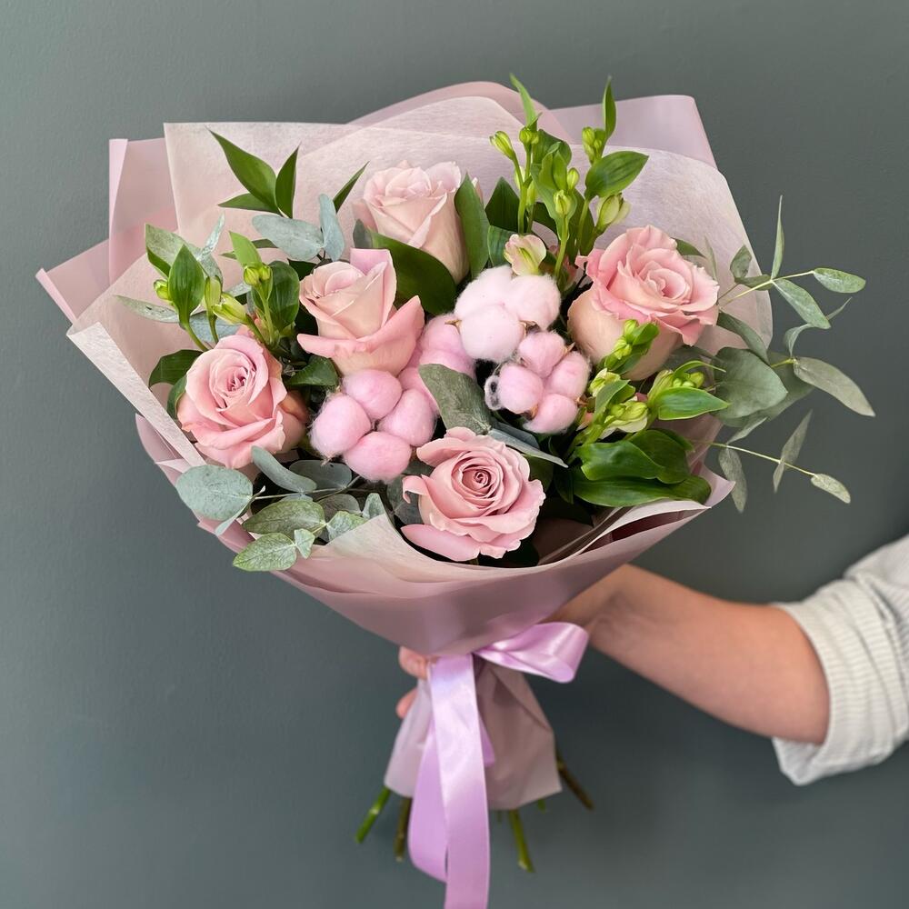 Альстромерия – 3 шт.Лента – 1 шт.Рускус – 5 шт.Хлопок – 4 шт.Эвкалипт – 2 шт.Роза одноголовая – 5 шт.бумага упаковочная – 1 шт.