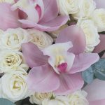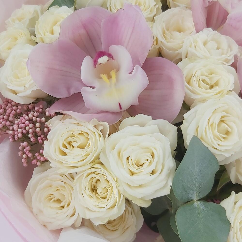 Роза кустовая Эквадор – 9 шт.Орхидея цимбидиум бутон – 3 шт.Озотамнус розовый – 5 шт.Эвкалипт – 3 шт.Пистация – 5 шт.Упаковка дизайнерская – 1 шт.