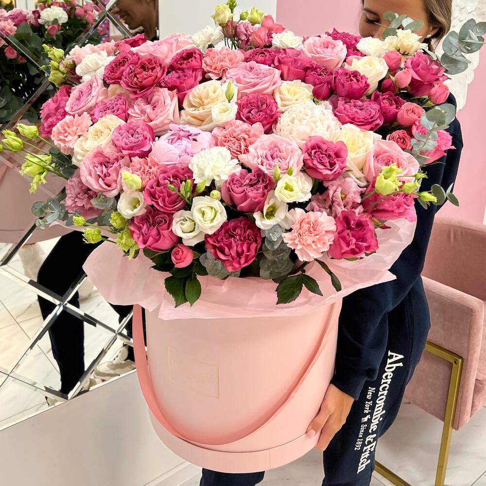 Роза пионовидная – 39 шт.Лизиантус – 12 шт.Пион – 4 шт.Диантус – 9 шт.Кустовая роза – 12 шт.Эвкалипт – 5 шт.Шляпная коробка – 1 шт.