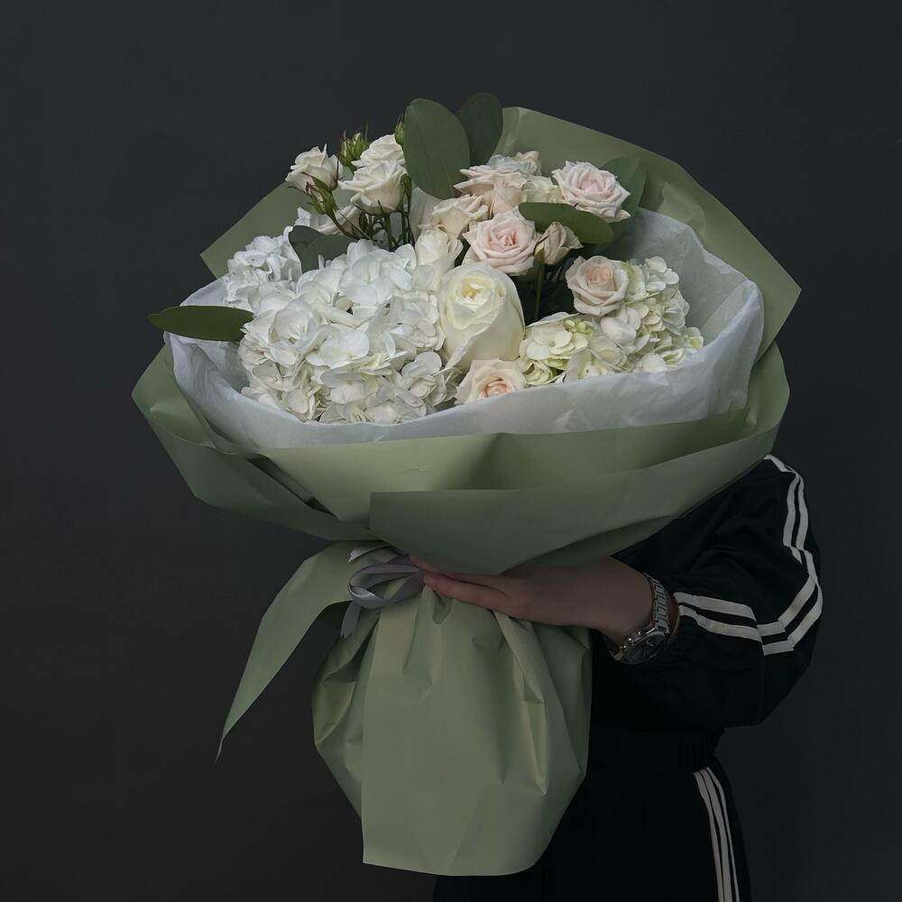 Альстромерии, Гвоздики, Кустовые розы, Лизиантусы, Розы, Хризантемы