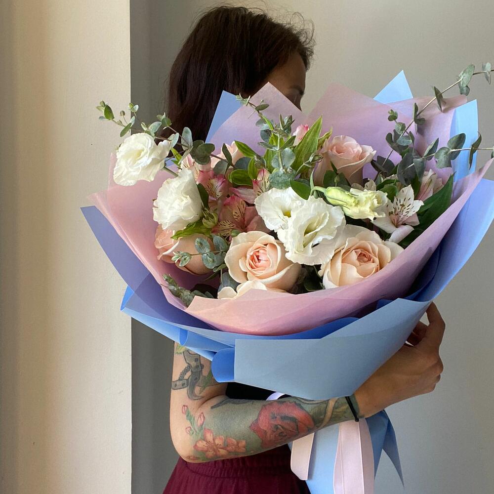 Гвоздики, Лизиантусы, Розы, Тюльпаны