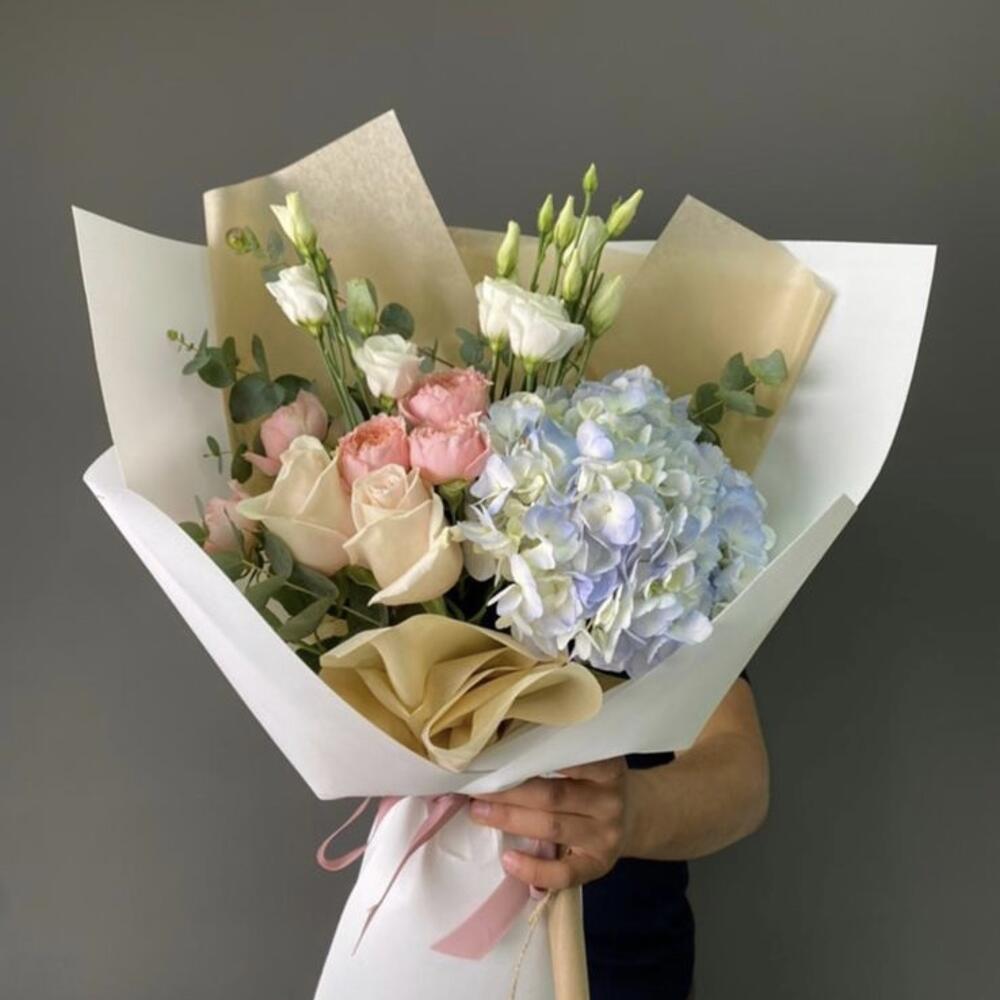 Гвоздики, Лизиантусы, Розы, Тюльпаны
