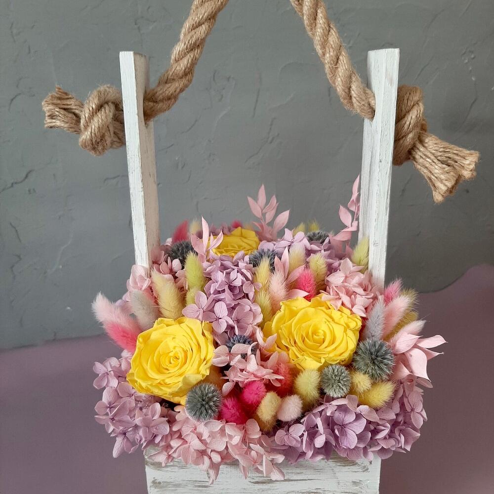 Роза одноголовая – 3 шт.Гортензия – 2 шт.пушистики – 1 шт.Деревянный ящик – 1 шт.