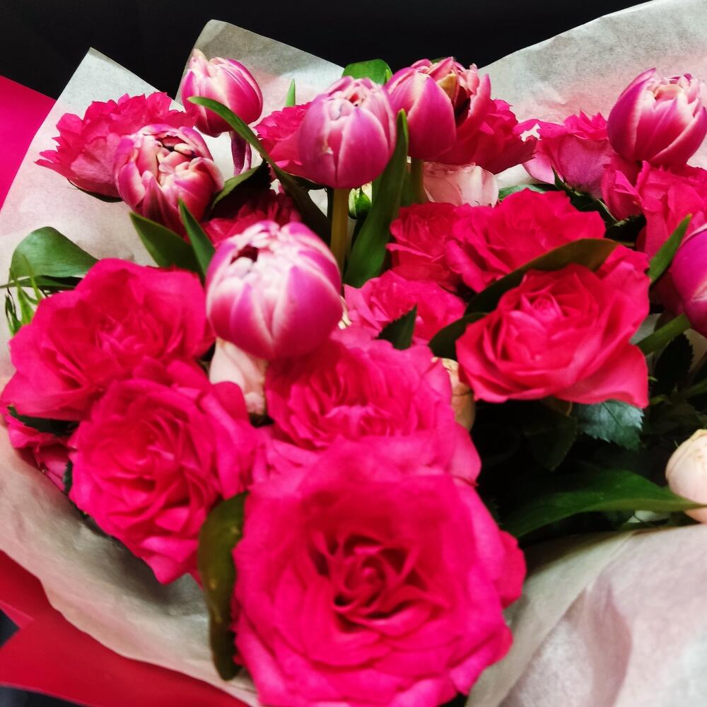 Рускус – 11 шт.Роза кустовая – 7 шт.Тюльпан – 7 шт.Упаковка дизайнерская – 1 шт.Лента атласная – 3 шт.