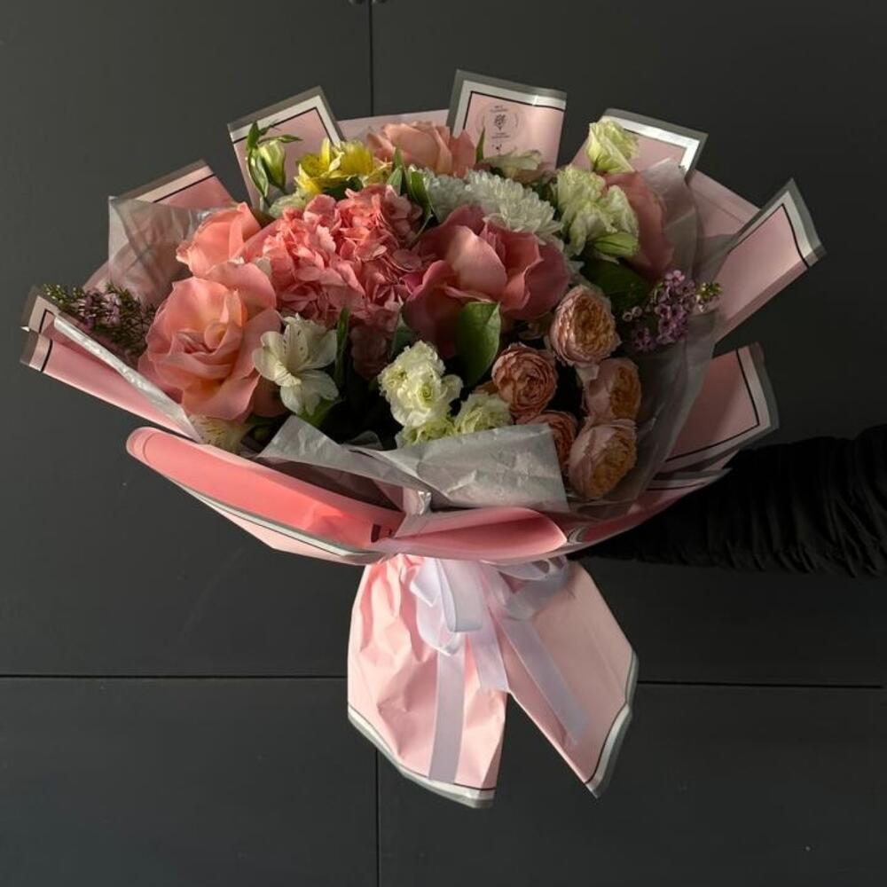 Альстромерии, Гвоздики, Кустовые розы, Лизиантусы, Розы, Хризантемы