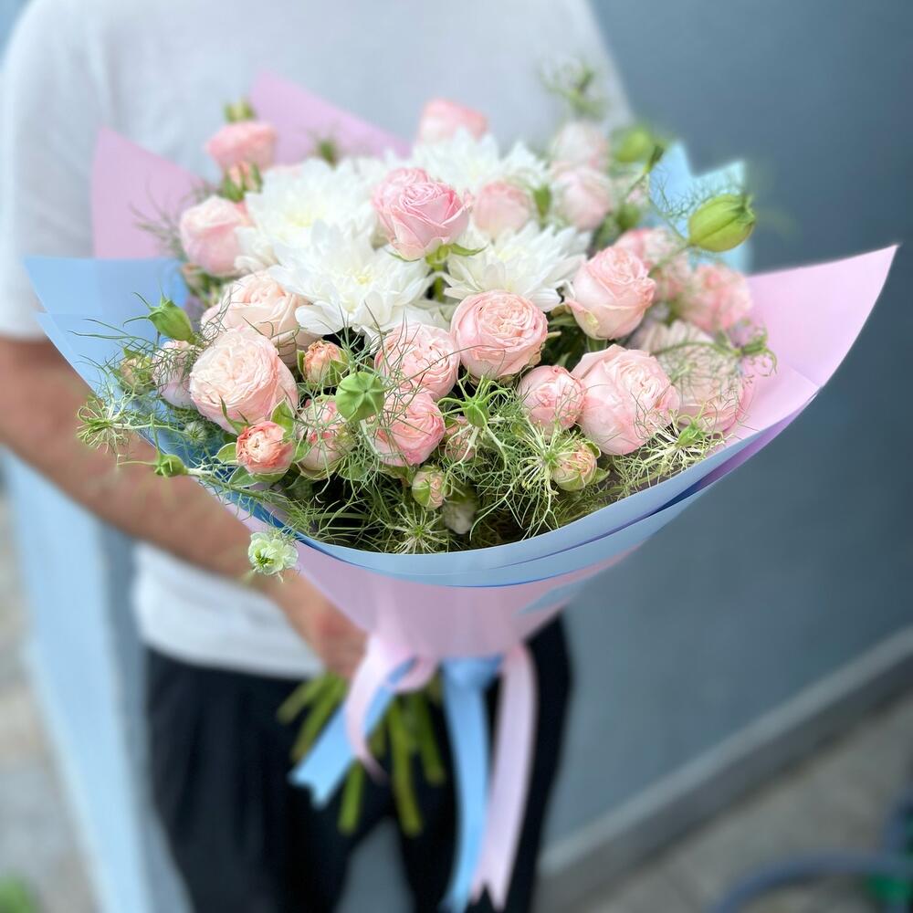 Spray rose – 7 шт. chrisantema – 7 шт. Decoration – 7 шт. packaging design – 1 шт. gift message card – 1 шт.