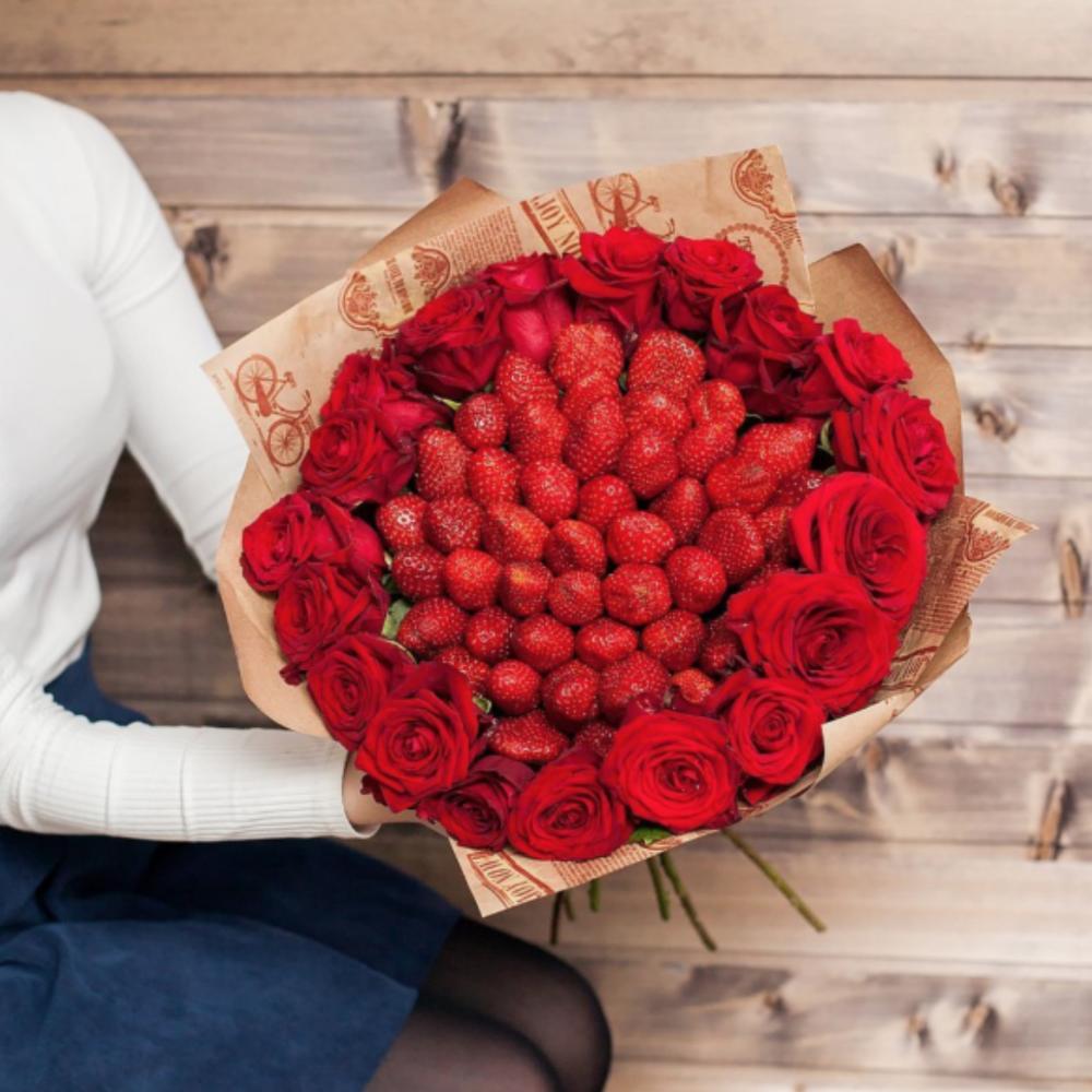 Клубника – 55 шт.Роза – 19 шт.Крафт упаковка – 1 шт.Лента – 1 шт.