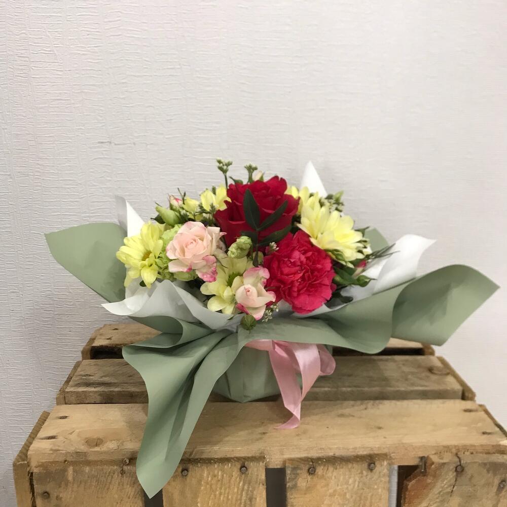 Хризантема кустовая – 1 шт.Хризантема Сантини – 1 шт.Фисташка – 2 шт.Упаковка дизайнерская – 1 шт.Оазис флористический – 1 шт.Лизиантус алиса пинк – 1 шт.роза кустовая кения 60 см – 2 шт.гвоздика стандарт – 3 шт.гвоздика moon – 2 шт.роза хот эксплорер 60 см – 1 шт.